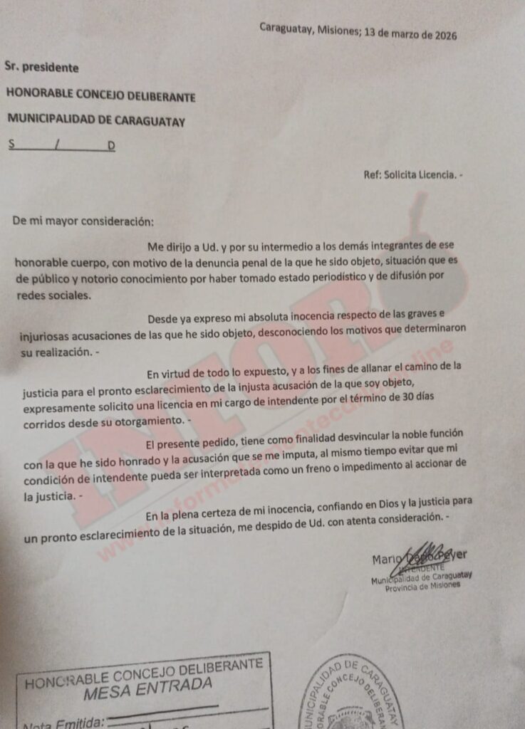 El intendente de Caraguatay, Mario Peyer, solicitó formalmente una licencia por el término de 30 días con el objetivo de ponerse a disposición de la Justicia ante la denuncia penal que tomó estado público en los últimos días.
